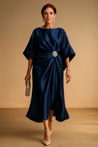 Celeste™ | Luxe Satin Draped Midi Dress with Crystal Brooch